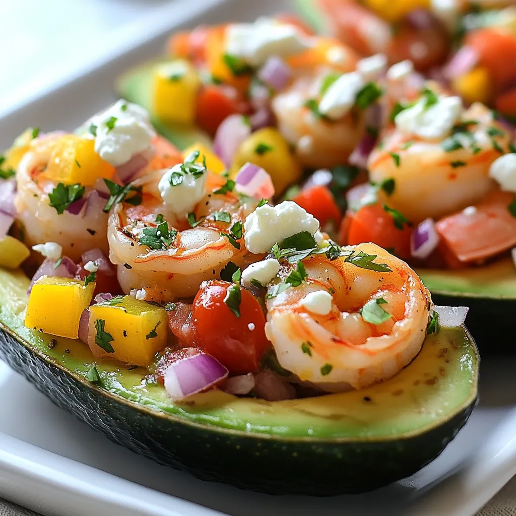 • Fill each avocado half with a generous amount of cooked shrimp, followed by the pico de gallo mixture.