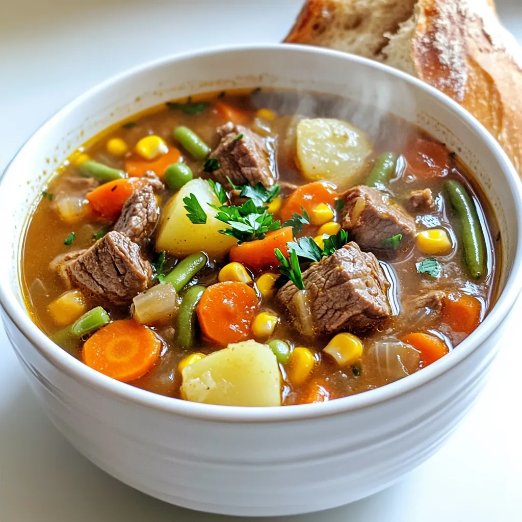 In this soup, beef stew meat gives a rich flavor. The beef broth adds depth. Fresh vegetables like carrots, potatoes, green beans, and corn add color and nutrition. The onion and garlic are key for a tasty base.