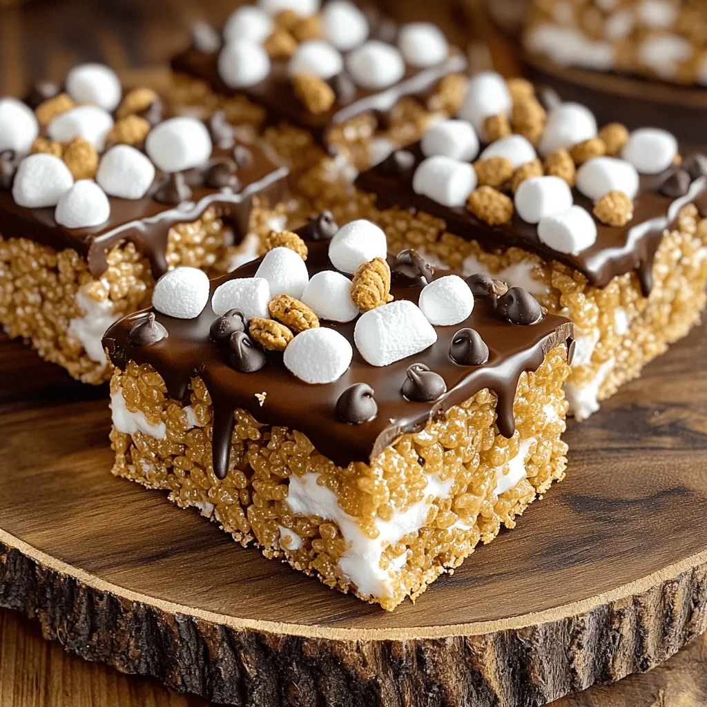 - 3 tablespoons unsalted butter - 4 cups mini marshmallows - 6 cups Rice Krispies cereal - 1 cup chocolate chips - 1 cup graham cracker crumbs - Pinch of salt To create these tasty S’mores Rice Krispie Treats, you need a few key ingredients. First, unsalted butter brings richness to the mix. Then, mini marshmallows are key for that gooey texture. Rice Krispies cereal provides the perfect crunch. Chocolate chips give a sweet burst of flavor. Graham cracker crumbs add a classic s’mores taste. Finally, a pinch of salt balances the sweetness. - Extra marshmallows - Additional chocolate chips You can take your treats to the next level with some optional toppings. Adding extra marshmallows gives a fun texture on top. Additional chocolate chips can make each bite even more chocolatey. These toppings make the treat look and taste even better! To start, grab a large saucepan. Place it on low heat and add 3 tablespoons of unsalted butter. Stir as it melts, making sure it does not brown. Next, add 4 cups of mini marshmallows. Keep stirring until the marshmallows melt completely and the mix is smooth. This step is key for a gooey treat! Now that your marshmallow mix is ready, it’s time to add flavor. Pour in 1 cup of graham cracker crumbs. Stir until well blended. The crumbs will give your treats that classic s'mores taste. Next, gradually add 6 cups of Rice Krispies cereal. Mix gently, ensuring the cereal gets coated in the sticky marshmallow mixture. You’re almost there! Now, fold in 1 cup of chocolate chips. This will add a nice chocolatey flavor. Press the mixture into a greased 9x13-inch baking dish. Use a spatula or wax paper to flatten it down. Make sure it’s packed tightly. For some extra fun, you can top with more mini marshmallows and chocolate chips. Let the treats cool completely at room temperature for about 30 minutes. Then, slice them into squares and enjoy! To get the best meltiness from your marshmallows, use low heat. This will help them melt smoothly without burning. Stir them constantly. This keeps the marshmallows from sticking and helps them melt evenly. When you pack the mixture into the dish, press it down firmly. A tightly packed treat holds together better and stays chewy. One big mistake is overheating the marshmallows. This can make them hard and sticky. You want them soft and gooey. Another mistake is not using enough butter. Butter adds flavor and keeps the treats from being too dry. Use three tablespoons for the right balance. To boost the chocolate flavor, add more chocolate chips. You can mix in a full cup instead of half. This makes every bite rich and yummy. You can also try different toppings. Consider adding nuts, sprinkles, or even fruit for a fun twist. These small changes can take your S’mores Rice Krispie Treats to the next level! {{image_2}} You can play with the classic S'mores Rice Krispie Treats recipe. One fun twist is to add peanut butter. Simply mix in ½ cup of creamy peanut butter when you melt the butter and marshmallows. This rich addition gives a nutty flavor that pairs well with chocolate and graham crackers. You can also add nuts or dried fruits for more texture. Chopped almonds, walnuts, or even mini chocolate-covered pretzels can add a nice crunch. For fruits, try dried cranberries or raisins. Mix them in right after adding the Rice Krispies cereal to spread the flavors evenly. If you're looking for gluten-free options, choose a gluten-free cereal. Brands like Rice Chex or gluten-free Rice Krispies work great. Just make sure to check the labels for safety. For vegan options, swap the butter for coconut oil or vegan butter. Use vegan marshmallows and dairy-free chocolate chips to keep your treats plant-based. This way, everyone can enjoy them without worry. You can change these treats with the seasons. For holidays, add festive sprinkles or colors. During Halloween, use orange and black sprinkles. For Christmas, try red and green ones. You can also experiment with different chocolate flavors. Dark chocolate, white chocolate, or mint chocolate can change the whole taste. Add these variations to keep things exciting for your family and friends. To keep your S'mores Rice Krispie Treats fresh, store them in an airtight container. This helps keep them soft and chewy. Use a container that fits the treats snugly to avoid air. You can stack them with parchment paper to prevent sticking. You can store these treats at room temperature. They stay good in a cool, dry place. If you live in a warm area, you might want to keep them in the fridge. This helps them last longer without getting too sticky. These treats can last up to a week when stored properly. After a week, they may start to lose their freshness. Signs of spoilage include hardening or a change in smell. If they feel too hard or smell off, it's best to toss them. If your treats get hard, you can bring them back to life. Place them in the microwave for a few seconds. Start with 10 seconds, checking often. You want them soft, not melted. You can also wrap them in a damp paper towel before microwaving. This adds some moisture back. Enjoy your treats fresh and gooey! Yes, you can use regular marshmallows! Regular marshmallows are larger and take longer to melt. They may not mix as well, making the treats a bit uneven. Mini marshmallows melt faster and blend nicely. They give you that gooey texture you want in each bite. If you choose regular ones, chop them up for better mixing. To amp up the chocolate flavor, try these ideas: - Add more chocolate chips: Mix in an extra half cup of chocolate chips. - Drizzle melted chocolate: After setting the treats, drizzle melted chocolate on top. - Use chocolate-covered graham crackers: Swap some regular graham cracker crumbs for crushed chocolate-covered ones. - Add cocoa powder: Mix in a tablespoon of cocoa powder with the marshmallows for a richer flavor. Yes, you can freeze these treats! Wrap them tightly in plastic wrap and store them in an airti