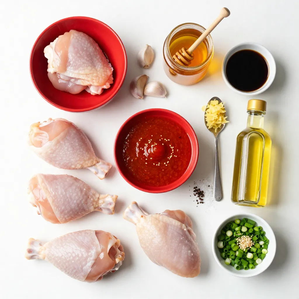 For the Sriracha Honey Glazed Chicken, you will need: - 4 boneless, skinless chicken thighs - 1/4 cup Sriracha sauce - 1/4 cup honey - 2 tablespoons soy sauce (low sodium) - 2 cloves garlic, minced - 1 teaspoon grated fresh ginger - 1 tablespoon sesame oil - Salt and pepper, to taste - Chopped green onions, for garnish - Sesame seeds, for garnish You can switch some ingredients if needed: - Chicken thighs work well, but you can use chicken breasts for a leaner option. - For a milder glaze, try using sweet chili sauce instead of Sriracha. - Use maple syrup instead of honey for a vegan version. - Coconut aminos can replace soy sauce for gluten-free cooking. - If you don't have fresh ginger, ground ginger can work in a pinch. You'll need a few basic tools to make this dish: - A large skillet for cooking the chicken - A small mixing bowl for the glaze - A whisk or fork to mix the glaze - A meat thermometer to check the chicken's doneness - A cutting board and knife for slicing the chicken These simple ingredients and tools make it easy to prepare a delicious meal. Enjoy the process as you create this savory flavor fusion! {{ingredient_image_1}} Start by mixing the glaze. In a small bowl, whisk together 1/4 cup Sriracha sauce, 1/4 cup honey, 2 tablespoons low-sodium soy sauce, 2 minced garlic cloves, 1 teaspoon grated fresh ginger, and 1 tablespoon sesame oil. This blend creates a sweet and spicy sauce. If you like more heat, add extra Sriracha. This glaze will coat the chicken and bring it to life. Next, season 4 boneless, skinless chicken thighs with salt and pepper. Heat a large skillet over medium-high heat. Add a drizzle of olive or avocado oil until it shimmers. Place the chicken thighs in the skillet. Cook them for 4-5 minutes without moving them. This step helps create a nice sear. After 4-5 minutes, flip the chicken. Pour half of the Sriracha honey glaze over the top. Cook for another 4-6 minutes. Make sure the chicken reaches an internal temperature of 165°F (75°C). This ensures your chicken is safe to eat. Once the chicken is cooked, remove it from the skillet. Let it rest for a few minutes to keep it juicy. When ready, slice the chicken. Drizzle any leftover glaze over the slices. For a beautiful finish, top with chopped green onions and sesame seeds. The pop of color makes the dish look great. Serve your Sriracha Honey Glazed Chicken over steamed rice or quinoa, paired with sautéed veggies for a complete meal. Enjoy the amazing flavors! To adjust the spice in your Sriracha honey glazed chicken, start small. You can always add more heat later. Mix your glaze with 2 tablespoons of Sriracha. Taste it. If you want more spice, add another tablespoon. If it’s too spicy, add more honey to balance it. Honey will calm the heat while keeping your glaze sweet. A great glaze has a nice shine. To get this, cook your chicken over medium-high heat. This method helps the glaze stick well. Pour half of the glaze on the chicken when you flip it. This allows the glaze to caramelize, creating a beautiful finish. Remember to keep some glaze for drizzling after cooking. Cooking chicken thighs well is key. I recommend pan-searing for the best flavor. Heat your skillet until it shimmers. This creates a nice sear. You can also bake or grill the thighs. If you grill, watch the temperature closely. Chicken should reach 165°F (75°C) inside to be safe. Always let your chicken rest before slicing. This keeps it juicy and tender. Pro Tips Marinate for More Flavor: If you have time, marinate the chicken thighs in the Sriracha honey glaze for at least 30 minutes or up to overnight. This will infuse the meat with deeper flavors. Adjust Spice Level: Feel free to tweak the amount of Sriracha based on your heat tolerance. For a milder glaze, substitute half of the Sriracha with ketchup. Use a Meat Thermometer: To ensure perfect doneness, use a meat thermometer. Chicken should reach an internal temperature of 165°F (75°C) for safe consumption. Garnish for Presentation: Enhance the dish's presentation by adding a sprinkle of chopped green onions and sesame seeds right before serving. This adds color and texture. {{image_2}} You can add colorful vegetables to this dish for more flavor and nutrients. Try using bell peppers, broccoli, or carrots. Simply slice them and toss them into the skillet with the chicken. Cook them until they are tender but still crisp. The glaze will cover the veggies perfectly, giving them a nice kick. If you want a different protein, consider using tofu or shrimp. For tofu, press and cube it before cooking. Cook it in the skillet until golden brown. Then, pour the glaze over it just like you would with chicken. For shrimp, add them to the skillet when the chicken is almost done. Cook them until they turn pink and opaque. Both options will soak up that delicious Sriracha honey glaze. To change the flavor profile, mix in different sauces or spices. For a Thai twist, add lime juice and chopped cilantro to the glaze. If you prefer BBQ, swap the Sriracha with your favorite BBQ sauce. You can also add smoked paprika for extra depth. These small changes create a whole new dish while keeping the same base recipe. To keep your Sriracha honey glazed chicken fresh, place leftovers in an airtight container. Make sure to cool the chicken to room temperature before sealing it. Store it in the fridge for up to three days. The glaze will soak into the chicken, enhancing its taste. If you want to save some for later, freezing is a great option. Wrap the chicken tightly in plastic wrap or foil. Then, place it in a freezer-safe bag or container. You can freeze the chicken for up to three months. When you’re ready to eat, thaw it in the fridge overnight. To reheat, I suggest using the oven for the best results. Preheat your oven to 350°F (175°C). Place the chicken on a baking sheet and cover it with foil. Heat for about 15-20 minutes or until warmed through. You can also reheat in a microwave, but the
