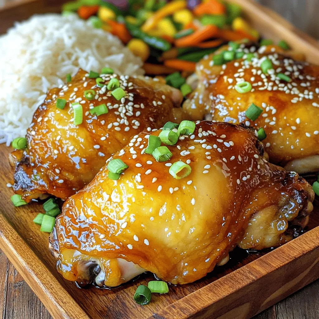 - 4 chicken thighs, bone-in and skin-on - 1/4 cup soy sauce - 1/4 cup honey - 2 tablespoons rice vinegar - 2 cloves garlic, minced - 1 inch fresh ginger, grated - 1 tablespoon sesame oil - 2 green onions, chopped (for garnish) - Sesame seeds (for garnish) - Salt and pepper to taste The main star of this dish is the chicken. I love using chicken thighs because they stay juicy and tender. The bone-in, skin-on variety gives you extra flavor and crunch. Next, we have the marinade. This is where the magic happens. I mix soy sauce, honey, and rice vinegar. This blend creates a sweet and salty flavor that makes the chicken shine. Aromatics like garlic and ginger add depth. The minced garlic gives a nice kick, while fresh ginger adds warmth. Finally, the garnishes. Chopped green onions and sesame seeds not only look great but also add a fresh crunch. You can’t skip these! Gather these ingredients, and you’re ready to make a meal that will impress everyone. To start, grab a mixing bowl. Combine these ingredients for a tasty marinade: - 1/4 cup soy sauce - 1/4 cup honey - 2 tablespoons rice vinegar - 2 cloves garlic, minced - 1 inch fresh ginger, grated - 1 tablespoon sesame oil Whisk until everything blends well. This sweet and salty mix will give your chicken great flavor. Next, take your chicken thighs. Season them with salt and pepper on both sides. Place the chicken in a zip-lock bag or a shallow dish. Pour the marinade over the chicken, ensuring every piece is covered. Seal or cover it and place it in the fridge. I like to marinate it for at least 1 hour, but overnight is even better for deeper flavor. When you are ready to cook, preheat your oven to 400°F (200°C). Take the marinated chicken out of the fridge. Place the chicken thighs in a baking dish, skin-side up. Pour any leftover marinade over them. Bake the chicken for about 30-35 minutes. You want the chicken to be cooked through and the skin to be crispy. If you want the skin extra crispy, keep an eye on it. In the last 10 minutes of baking, turn your oven to broil. This step caramelizes the chicken skin, adding a nice sticky glaze. Watch the chicken closely to avoid burning. The glaze should look shiny and delicious. Once the chicken is done, let it rest for a few minutes. This helps keep it juicy. To serve, place the chicken on a platter. Garnish it with chopped green onions and a sprinkle of sesame seeds. For a complete meal, add steamed rice and sautéed vegetables on the side. Drizzle any leftover sauce from the dish over the chicken for added flavor. Enjoy your sticky honey soy chicken! For the best flavor, I suggest marinating the chicken for at least one hour. If you have more time, marinate it overnight. This allows the chicken to soak up all the tasty flavors. You can choose to bake or grill the chicken. Baking is easy and makes the skin crispy. If you grill, it adds a nice smoky taste. Both methods work well, so pick what you prefer. To spice things up, consider adding a pinch of red pepper flakes. You can also mix in some chopped cilantro or lime juice for a fresh twist. These small changes can make a big difference in flavor. {{image_2}} If you want to try something different, you can use chicken breasts instead of thighs. Chicken breasts cook faster and can still absorb the tasty marinade. Just cut them into smaller pieces to help them soak up more flavor. Tofu is another great option for a plant-based meal. Use firm or extra-firm tofu for the best texture. Press the tofu to remove excess water before marinating. This helps it soak up the honey soy goodness. Want to spice things up? You can add sriracha or chili sauce for heat. Just mix in one or two tablespoons with your marinade. If you like a smoky flavor, add smoked paprika. For an Asian twist, try adding five-spice powder or sesame seeds. If you're feeling adventurous, mix in some citrus juice, like lime or orange, for a bright taste. This will give your dish a fresh kick that pairs well with the sweetness of honey. If you need a gluten-free version, look for gluten-free soy sauce. It tastes just as good as regular soy sauce. For a low-sugar option, reduce the honey by half and add some extra vinegar. You can also use a sugar substitute like stevia or monk fruit sweetener in the marinade. Always check labels for any hidden gluten or sugar in sauces. These small changes will help you enjoy sticky honey soy chicken while meeting your dietary needs. To keep your sticky honey soy chicken fresh, store leftovers in an airtight container. Make sure the chicken is cool before putting it away. This helps maintain its flavor and texture. Place it in the fridge within two hours after cooking. Enjoy it within three to four days for the best taste. Always reheat it until it’s hot throughout. If you want to save your chicken for later, freezing is a great option. Wrap each piece tightly in plastic wrap. Then, place them in a freezer-safe bag. Remove as much air as you can to prevent freezer burn. The chicken can last up to three months in the freezer. When you're ready to eat, thaw it in the fridge overnight. Reheat it in the oven or microwave until hot. In the fridge, sticky honey soy chicken lasts about three to four days. In the freezer, it stays good for up to three months. Always check for any off smells or changes in texture before eating. Storing it properly helps keep your meal flavorful and safe! I recommend marinating the chicken for at least one hour. For the best flavor, marinate it overnight. The longer you marinate, the more the chicken soaks up the sweet and savory sauce. This gives you a juicy and flavorful meal every time. Yes, you can use skinless chicken thighs. However, skin-on chicken gives a richer flavor and crispy texture. Skinless thighs will cook faster and may be less juicy. If you prefer a lighter option, skinless is a great choice. Just keep an eye on the cooking time. You can serve sticky honey soy chicken with several tasty sides. Here are s