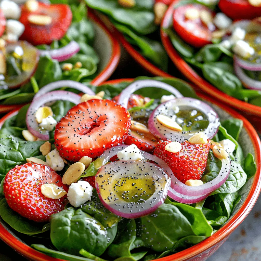 This salad is a perfect mix of greens and fruits. Baby spinach makes a fresh base. Strawberries add sweet and juicy flavor. Toasted almonds give a nice crunch. Red onion adds a hint of sharpness. Feta cheese brings creaminess and tang. Poppy seeds add a bit of texture and flair.