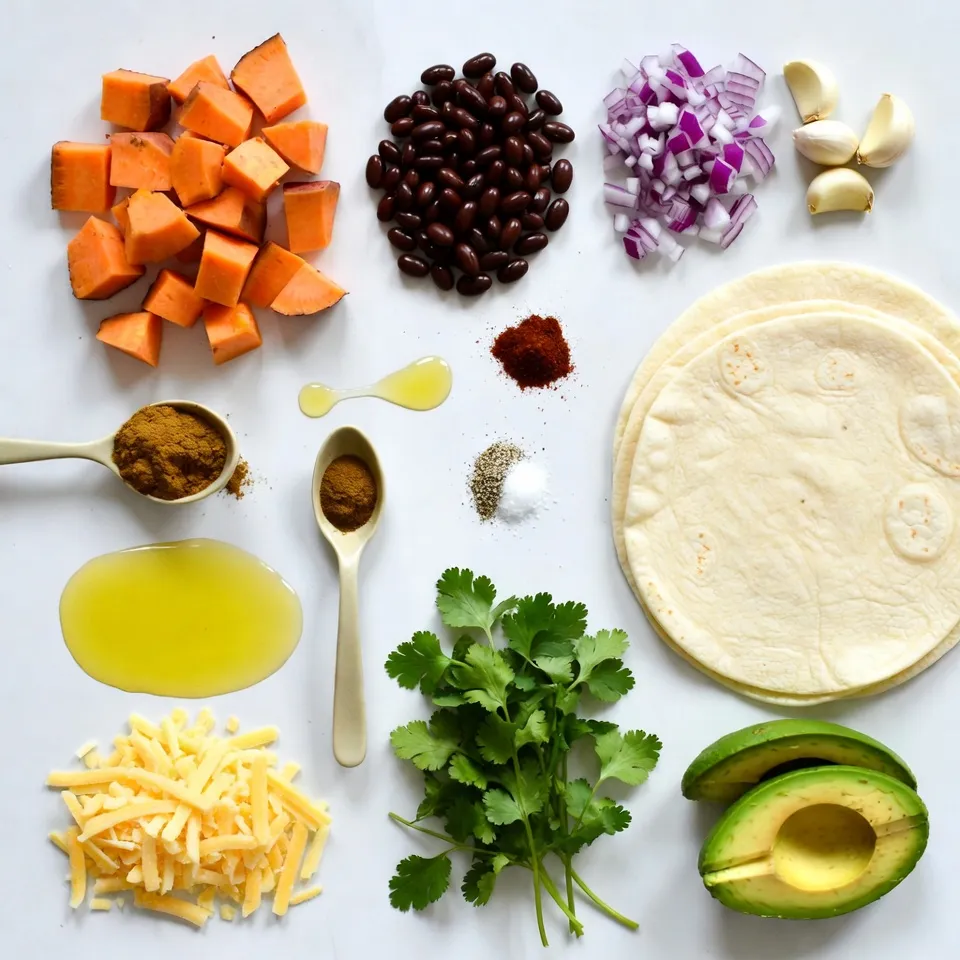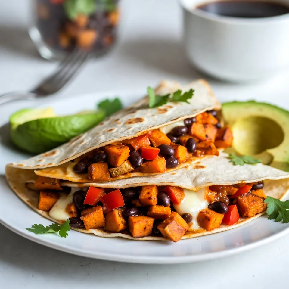 - 2 medium sweet potatoes, peeled and diced - 1 can (15 oz) black beans, rinsed and drained - 1 red bell pepper, diced - 1 small red onion, finely chopped - 2 cloves garlic, minced - 1 teaspoon cumin - 1 teaspoon smoked paprika - 1 tablespoon olive oil - Salt and pepper to taste - 4 large flour tortillas - 1 cup shredded cheese (e.g., cheddar or Monterey Jack) - Fresh cilantro for garnish - Avocado slices for serving (optional) This recipe uses basic ingredients that pack a lot of flavor. You can switch black beans for pinto beans or chickpeas if you like. For a dairy-free option, use vegan cheese or skip it entirely. Want to make it gluten-free? Just swap flour tortillas for corn tortillas. You can also add spinach or kale for extra greens. These small tweaks help meet different diets and tastes. Feel free to get creative! {{ingredient_image_1}} 1. Preheat your oven. Set it to 400ยฐF (200ยฐC). This helps cook the sweet potatoes well. 2. Prepare the sweet potatoes. Peel and dice 2 medium sweet potatoes into small cubes. Toss them in a bowl with 1 tablespoon of olive oil, 1 teaspoon of cumin, 1 teaspoon of smoked paprika, and some salt and pepper. Mix it well. 3. Spread on a baking sheet. Place the sweet potato cubes evenly on a baking sheet. They need space to roast. 4. Roast the sweet potatoes. Cook in the oven for about 20-25 minutes. Stir halfway through. They should be tender and a bit caramelized when done. 5. Sautรฉ the vegetables. While the sweet potatoes bake, heat a skillet over medium heat. Add 1 small finely chopped red onion. Cook for 3-4 minutes until it turns translucent. 6. Add garlic and bell pepper. Dice 1 red bell pepper and add it to the skillet. Then, add 2 minced garlic cloves. Sautรฉ for 2-3 more minutes until soft. 1. Mix the filling. Once the sweet potatoes are ready, add them to the skillet with the sautรฉed onions, garlic, and bell pepper. Add 1 can of rinsed and drained black beans. Mix everything well and cook for another 2-3 minutes. Taste and adjust seasoning if needed. 2. Fill the tortillas. Take a large flour tortilla and sprinkle about 1/4 cup of shredded cheese on one half. Spoon some sweet potato and black bean mixture over the cheese. Fold the tortilla in half. 3. Cook the quesadilla. Place the filled tortilla in a clean skillet over medium heat. Cook for 3-4 minutes on each side. The tortillas should turn golden brown and the cheese should melt. 4. Repeat and serve. Do this with the rest of the tortillas and filling. Cut each quesadilla into wedges. Serve them hot with fresh cilantro and avocado slices if you like. - To ensure even cooking of sweet potatoes, cut them into similar-sized pieces. This helps them cook at the same rate. Toss them in olive oil and seasonings. Spread them on a baking sheet without crowding. Stir halfway through roasting for the best results. - For perfect quesadilla texture, use medium heat. This allows the cheese to melt while the tortilla gets crispy. Flip the quesadilla gently to avoid spilling the filling. Cook until both sides are golden brown. - For garnishes, fresh cilantro adds a bright flavor. Sliced avocado gives a creamy texture. A squeeze of lime juice enhances the dish. - Pair your quesadillas with a side of salsa or guacamole. A simple green salad also works well. These sides balance the flavors and make your meal complete. Pro Tips Roasting Sweet Potatoes: Ensure the sweet potatoes are cut into even-sized pieces for uniform roasting and optimal caramelization. Cheese Variations: Feel free to mix different types of cheese, such as pepper jack for a spicy kick or a blend for added flavor. Skillet Temperature: Keep the skillet at medium heat to avoid burning the tortillas while ensuring the cheese melts perfectly. Serving Suggestions: Add a dollop of sour cream or a squeeze of lime juice on top for a refreshing contrast to the rich flavors. {{image_2}} If you want to mix it up, try other legumes or veggies. For example, you can use chickpeas or lentils instead of black beans. You can also add spinach or zucchini for extra color and nutrition. This keeps the dish fresh and fun. When it comes to cheese, don't feel limited. Cheddar is great, but Monterey Jack adds a nice creaminess. You can also try pepper jack for a little kick. If you want a dairy-free option, use vegan cheese. It melts well and tastes good too. If you love heat, add jalapeรฑos or your favorite hot sauce. Dicing fresh jalapeรฑos gives a nice crunch and spice. You can also mix in some crushed red pepper flakes for a kick. Just be careful not to add too much; you want to enjoy the flavors. For a spicier filling, consider adding spices like cayenne pepper. This can change the flavor profile and make your quesadillas exciting. Adjust the heat to match your taste, and enjoy these tasty bites! After you make sweet potato black bean quesadillas, you might have some left. To store them, let the quesadillas cool first. Then, wrap each one in plastic wrap. You can also place them in an airtight container. This keeps them fresh in the fridge for about 3-4 days. For longer storage, freezing works great. Wrap the cooled quesadillas in foil or freezer-safe bags. They can last up to 3 months in the freezer. When youโ€™re ready to eat, just thaw them in the fridge overnight before reheating. To reheat your quesadillas, I recommend using a skillet. Heat the skillet over medium heat. Place the quesadilla in the skillet for about 2-3 minutes on each side. This helps make them crispy again. You can also use an oven. Preheat the oven to 350ยฐF (175ยฐC), and bake for about 10-15 minutes. Avoid using a microwave if you want to keep them crispy. The microwave may make the tortillas soggy. Enjoy your quesadillas hot and crispy! Can I make these quesadillas ahead of time? Yes, you can make these quesadillas ahead. Cook the filling and let it cool. Place it in the fridge. When you are ready, fill the tortillas and cook them. This sa