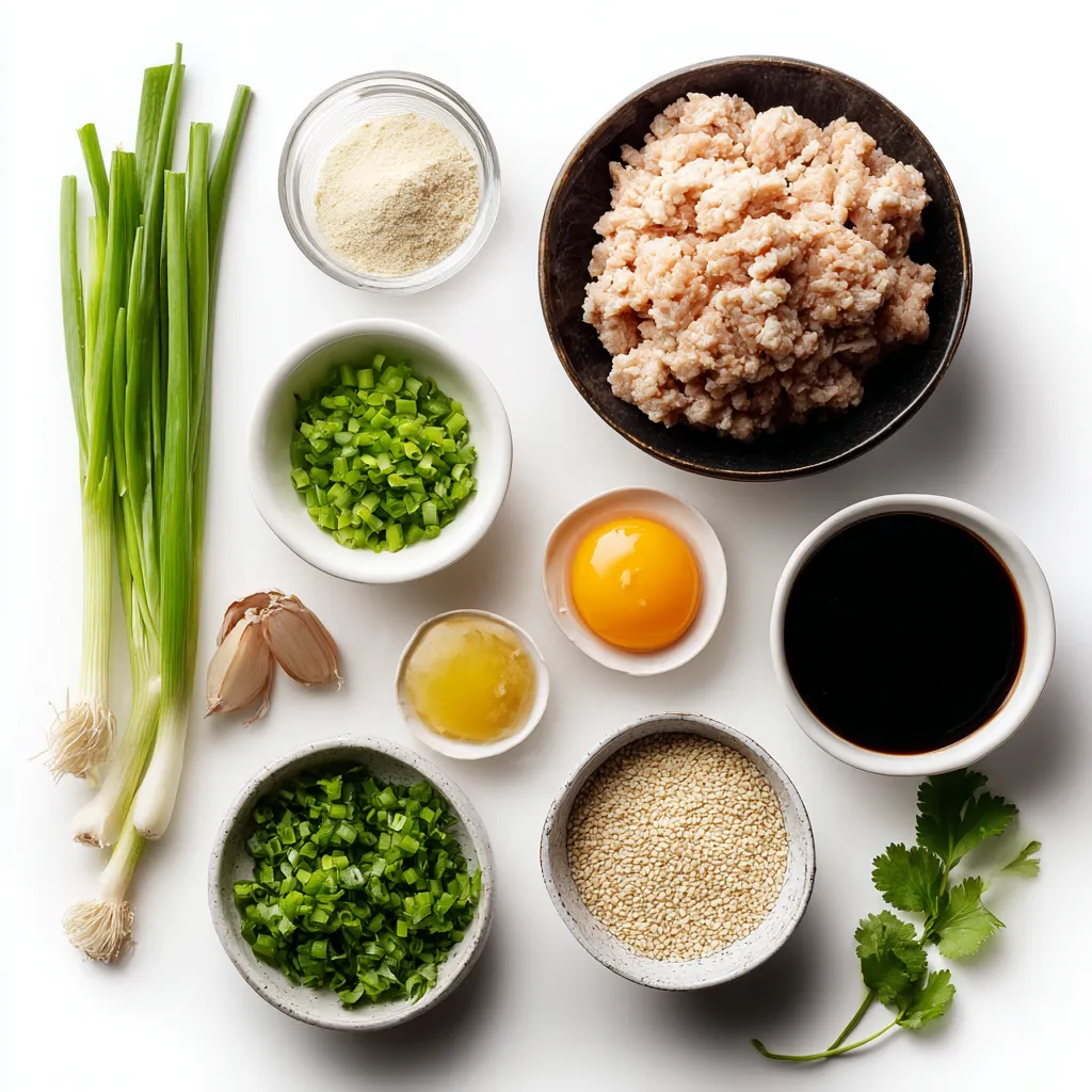 • In a large bowl, combine the ground chicken, breadcrumbs, chopped green onions, minced garlic, grated ginger, beaten egg, soy sauce, sesame oil, salt, and pepper. Mix until well combined.