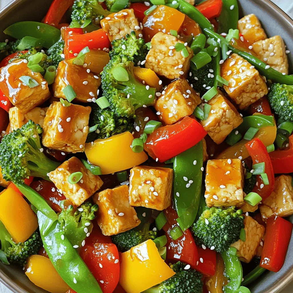 - 1 block (14 oz) firm tofu - 2 tablespoons cornstarch - 2 tablespoons vegetable oil - 1 red bell pepper, sliced - 1 yellow bell pepper, sliced - 1 cup broccoli florets - 1 cup snap peas - 3 cloves garlic, minced - 1 teaspoon ginger, grated - ½ cup teriyaki sauce (store-bought or homemade) - 2 green onions, sliced (for garnish) - Sesame seeds (for garnish) To make a great teriyaki tofu stir fry, you need just a few key ingredients. First, use a block of firm tofu. This type holds its shape well and absorbs flavors nicely. Press the tofu to remove excess water. This makes it crispier when cooked. Next, you will need cornstarch. It helps create a nice crust on the tofu. The right oil is also vital; vegetable oil works best for frying. For the veggies, I love using red and yellow bell peppers. They bring color and sweetness. Broccoli florets and snap peas add crunch and nutrition. Don't forget the garlic and ginger! They pack a flavor punch and make the dish smell amazing. Finally, teriyaki sauce ties it all together. You can buy it or make your own. Green onions and sesame seeds are great for garnish. They add a nice touch and extra flavor. - First, drain the tofu. Press it to remove extra water. - Next, cut the tofu into bite-sized cubes. This helps it cook evenly. - Finally, coat each cube with cornstarch. This will make the tofu crispy. - Heat oil in your skillet or wok. Use medium-high heat for the best results. - Add the tofu cubes in a single layer. Cook them until they are golden and crispy. This takes about 3-4 minutes per side. - In the same skillet, add more oil. Sauté minced garlic and grated ginger for 30 seconds. - Then, add sliced red and yellow bell peppers, broccoli florets, and snap peas. - Stir fry for about 5-7 minutes. You want them tender but still crisp. - Return the crispy tofu to the skillet with the veggies. - Pour the teriyaki sauce over everything. - Toss gently to coat all ingredients. Cook for another 2-3 minutes until heated through. To get crispy tofu, you need to press it first. This removes extra water. After pressing, cut the tofu into small cubes. Coat each piece with cornstarch. This makes the tofu crunchy when cooked. Heat oil in a skillet over medium-high heat. Cook tofu in a single layer for about 3-4 minutes on each side. Flip them carefully until they are golden brown. For this stir fry, I love using a mix of colorful veggies. Red and yellow bell peppers add sweetness. Broccoli gives a nice crunch. Snap peas add a fresh taste. When cooking, add the harder veggies first. Bell peppers and snap peas need less time to cook. Stir fry them for about 5-7 minutes until they are tender but still crisp. Serve your teriyaki tofu stir fry with jasmine rice or quinoa. These sides soak up the sauce well. For a nice touch, garnish your dish with sliced green onions and sesame seeds. You can also add a few chili slices for color. Serve it in a large bowl or on individual plates for a great presentation. {{image_2}} You can change the protein in your stir fry easily. Here are some options: - Tofu Types: Use silken tofu for a softer dish. Extra-firm tofu gives a firmer bite. - Alternative Proteins: Try chicken or shrimp for a meatier meal. Tempeh is also a great choice for a plant-based boost. Each protein adds its own flavor and texture, making the dish unique every time. If you want to make your teriyaki sauce, here’s a simple recipe: - Mix ½ cup soy sauce, ¼ cup honey or maple syrup, 1 tablespoon rice vinegar, and 1 teaspoon cornstarch. Heat until thick. You can also swap the teriyaki sauce for other sauces: - Sesame sauce: Adds nutty flavor. - Sweet chili sauce: Gives a spicy kick. Experimenting with sauces can change the whole taste of your dish! You can adapt this stir fry to fit your diet: - Vegan Options: Use plant-based sauces and stick with tofu. - Gluten-Free: Ensure your soy sauce is gluten-free. - Low-Carb: Use more veggies and skip the rice. Cauliflower rice is a great substitute. These changes help you enjoy the meal while meeting your dietary needs! To keep your teriyaki tofu stir fry fresh, use airtight containers. Glass or plastic containers work well. Label the containers with the date, so you know when you made them. Store the leftovers in the fridge for up to three days. If you want to keep them longer, freeze the stir fry. Place it in freezer-safe bags or containers. It can last for about two months in the freezer. When reheating, you want to keep that nice texture. The best way is to use a skillet. Heat it on medium heat and add a splash of water or oil. Stir the tofu and veggies gently. This keeps them from getting mushy. Heat for about 5-7 minutes or until hot. If using a microwave, cover the bowl loosely. Heat for 1-2 minutes, stirring halfway. Check that everything is warm before serving again. Teriyaki tofu stir fry lasts about 3 to 4 days in the fridge. Store it in an airtight container. This keeps the flavors fresh and the tofu nice. Yes, you can use frozen vegetables! They are quick and easy. Just add them to the pan and cook a little longer. This way, you save time and still enjoy a great meal. You can use soy sauce mixed with honey or maple syrup. Another option is a mix of soy sauce, rice vinegar, and brown sugar. These substitutes will give you a tasty flavor. To make this dish gluten-free, use gluten-free soy sauce or tamari. Most teriyaki sauces may contain gluten, so check the label. This way, you can enjoy the meal without worry. Yes, making teriyaki sauce at home is easy! Just mix soy sauce, honey, rice vinegar, and a little ginger. Heat it in a pan until it thickens. This fresh sauce adds great flavor to your stir fry! In this blog post, we explored a tasty teriyaki tofu stir fry. We covered ingredients, step-by-step cooking methods, and tips for the best results. Remember to press your tofu and coat it with cornstarch for crispiness. You can swap proteins or try different sauces too. Store leftovers carefully and reheat