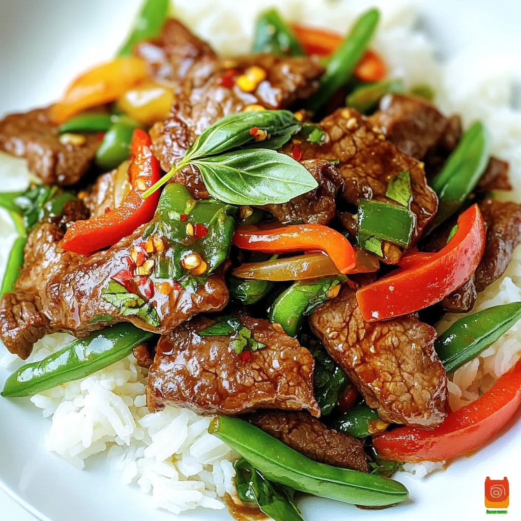 A flavorful stir fry featuring tender beef, fresh basil, and vibrant vegetables.