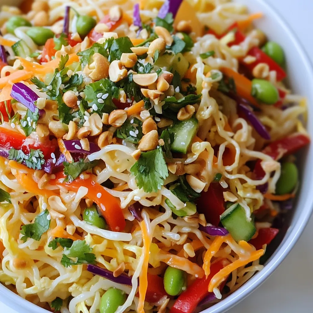 - 8 oz rice noodles - 1 cup shredded carrots - 1 bell pepper, thinly sliced - 1 cucumber, julienned - 1 cup red cabbage, thinly sliced - 1 cup edamame, shelled - 2 green onions, chopped - 1/4 cup fresh cilantro, chopped - 1/4 cup peanuts, chopped Rice noodles form the base of this salad. They soak up the sauce well. Shredded carrots add sweet crunch. Bell pepper brings color and flavor. Cucumber adds refreshing coolness. Red cabbage offers a nice crunch too. Edamame gives protein and texture. Green onions add a mild onion taste. Fresh cilantro finishes the dish with bright flavor. Peanuts provide a satisfying crunch and nutty taste. - 1/3 cup creamy peanut butter - 2 tablespoons soy sauce - 2 tablespoons lime juice - 1 tablespoon honey or maple syrup - 1 tablespoon sesame oil - 1 teaspoon grated ginger - 1 small garlic clove, minced - Water, as needed The peanut sauce is rich and creamy. Use smooth peanut butter for best results. Soy sauce adds umami flavor. Lime juice gives it a zesty kick. Honey or maple syrup adds sweetness. Sesame oil gives it depth. Grated ginger adds warmth. Minced garlic brings a bold taste. If the sauce is thick, thin it with water. - Alternative garnishes: more peanuts, sesame seeds - Other vegetables for customization: bell peppers or snap peas Feel free to get creative! You can add more garnishes like sesame seeds for extra crunch. Swap in other veggies like snap peas or bell peppers for variety. This salad is all about personal taste, so make it yours! {{ingredient_image_1}} To start, bring a large pot of water to a boil. Add 8 oz of rice noodles to the pot. Cook them according to the package instructions until they are al dente. This usually takes about 4 to 6 minutes. Once done, drain the noodles and rinse them under cold water. This step cools the noodles and stops the cooking process. Set the noodles aside while you prepare the rest of the salad. Now, let’s make the peanut sauce. In a mixing bowl, combine 1/3 cup of creamy peanut butter, 2 tablespoons of soy sauce, and 2 tablespoons of fresh lime juice. Add 1 tablespoon of honey or maple syrup for sweetness. Then, pour in 1 tablespoon of sesame oil. For some heat, add 1 teaspoon of grated ginger and 1 minced garlic clove. Whisk everything together until it’s smooth. If the sauce feels too thick, add a little water. Do this one tablespoon at a time until you reach the right consistency. In a large salad bowl, combine the cooked rice noodles with your fresh veggies. You need 1 cup of shredded carrots, 1 thinly sliced bell pepper, 1 julienned cucumber, 1 cup of thinly sliced red cabbage, and 1 cup of shelled edamame. Also, add 2 chopped green onions. Once your veggies and noodles are in the bowl, pour the peanut sauce over the mixture. Toss everything together gently. Make sure all the ingredients are well coated in the sauce. For a final touch, sprinkle 1/4 cup of chopped cilantro and 1/4 cup of chopped peanuts on top. This adds flavor and crunch. Enjoy your colorful, tasty salad! To get the best noodles, cook them just until they are al dente. This means they should be firm but not hard. Follow the package instructions for timing. After cooking, drain the noodles. Rinse them with cold water. This stops the cooking and helps prevent sticking. - Cook noodles for recommended time. - Rinse in cold water to stop cooking. - Toss with a little oil to prevent sticking. To boost the flavor, think about adding spices. A pinch of red pepper flakes gives heat. Fresh herbs like mint or basil add brightness. If you want to switch up the peanut sauce, try using almond butter instead of peanut butter. You can also use tamari instead of soy sauce for a gluten-free option. - Add red pepper flakes for heat. - Swap almond butter for peanut butter. - Use tamari for a gluten-free sauce. For a lovely presentation, arrange ingredients nicely. Layer the salad in a clear bowl to show off colors. Scatter chopped peanuts and cilantro on top for crunch and color. This salad is best served cold but can also be enjoyed at room temperature. Chill it for about 30 minutes before serving for the best taste. - Layer ingredients for a colorful display. - Serve cold or at room temperature. - Chill for 30 minutes for richer flavors. Pro Tips Fresh Ingredients: Use the freshest vegetables and herbs possible for the best flavor and crunch in your salad. Customizable Sauce: Adjust the peanut sauce by adding more lime juice for tanginess or more honey for sweetness, depending on your taste preference. Chill Before Serving: Allow the salad to chill in the refrigerator for at least 30 minutes to let the flavors meld together beautifully. Make Ahead: This salad can be made ahead of time. Just keep the sauce separate until you’re ready to serve to prevent sogginess. {{image_2}} You can enhance your Thai Peanut Noodle Salad by adding protein. Chicken, tofu, or shrimp work great. - Chicken: Grill or poach the chicken. Chop it into bite-sized pieces and mix it in. - Tofu: Use firm tofu for a good texture. Press it, cube it, and sauté until golden. - Shrimp: Cook shrimp until pink and tender. Add them to the salad for a seafood twist. Choose what you like best! Each option adds flavor and makes your meal more filling. Making this salad vegan or gluten-free is simple. Just swap a few ingredients. - Vegan: Use maple syrup instead of honey for sweetness. - Gluten-Free: Make sure to use gluten-free soy sauce. It’s easy to find in stores. These swaps keep the salad tasty while fitting your diet. You can change the salad based on what is fresh and in season. - Spring: Add fresh peas or snap peas for a crisp touch. - Summer: Include ripe tomatoes or fresh corn for sweetness. - Fall: Swap in roasted sweet potatoes for a warm flavor. - Winter: Use kale instead of cabbage for a hearty crunch. These seasonal swaps keep the salad exciting and full of flavor. To keep your Thai peanut noodle salad fresh, use an airtight container. This helps prevent moisture an
