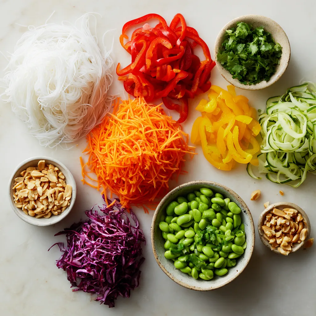 • Combine Salad Ingredients: In a large salad bowl, add the cooked rice noodles, shredded carrots, sliced bell pepper, julienned cucumber, red cabbage, edamame, and chopped green onions.