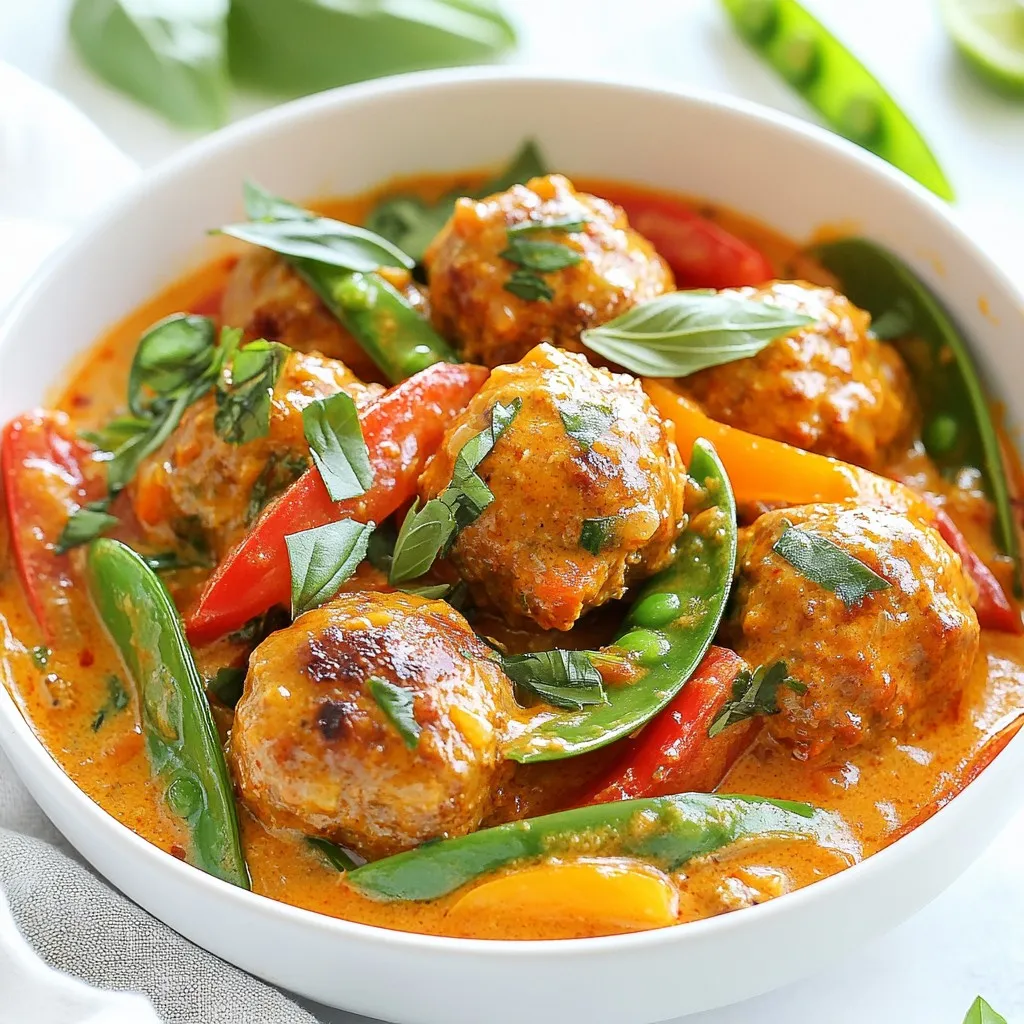 Delicious meatballs infused with Thai flavors, served in a creamy coconut milk sauce with vegetables.