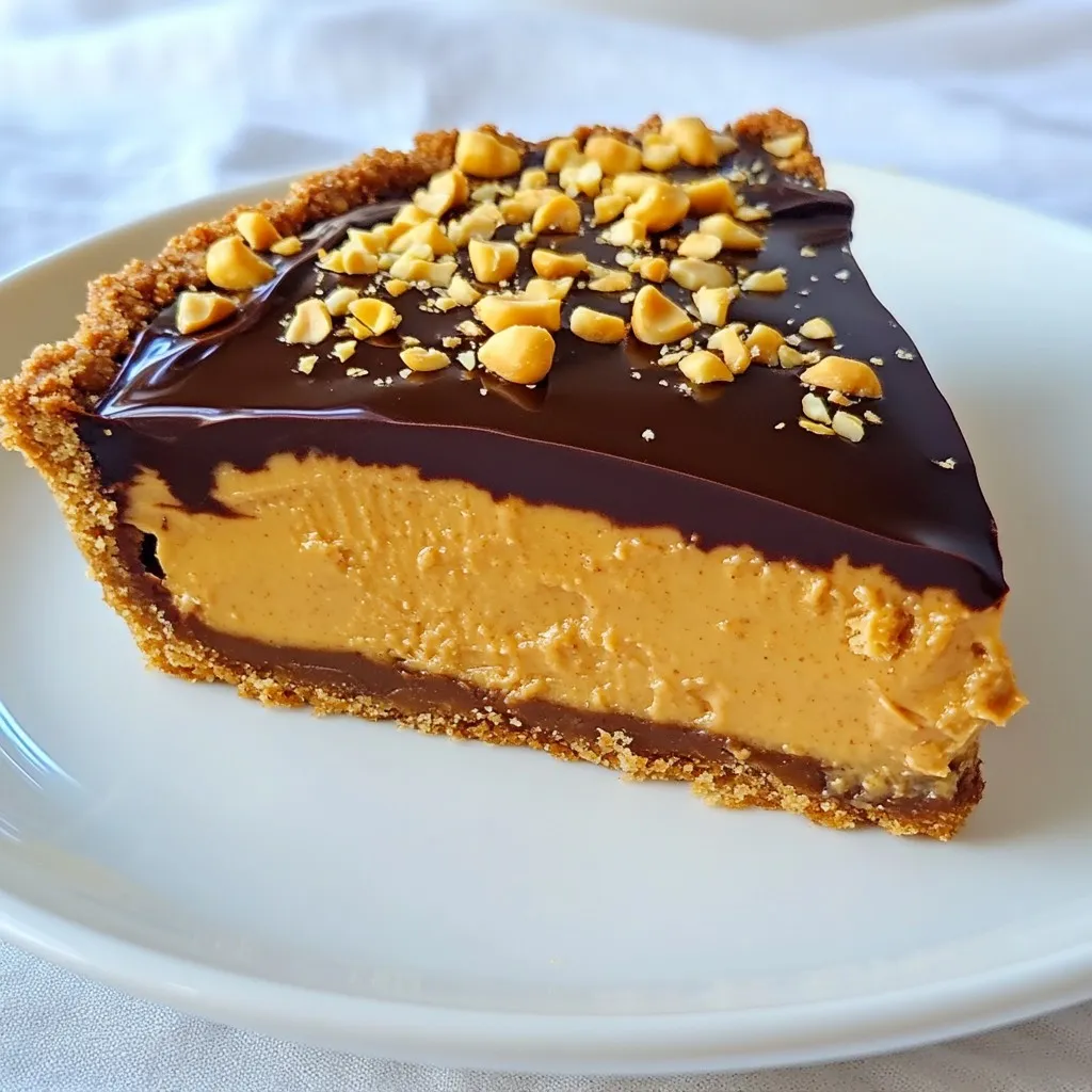 A delicious and creamy vegan pie with a peanut butter filling and a chocolate topping.