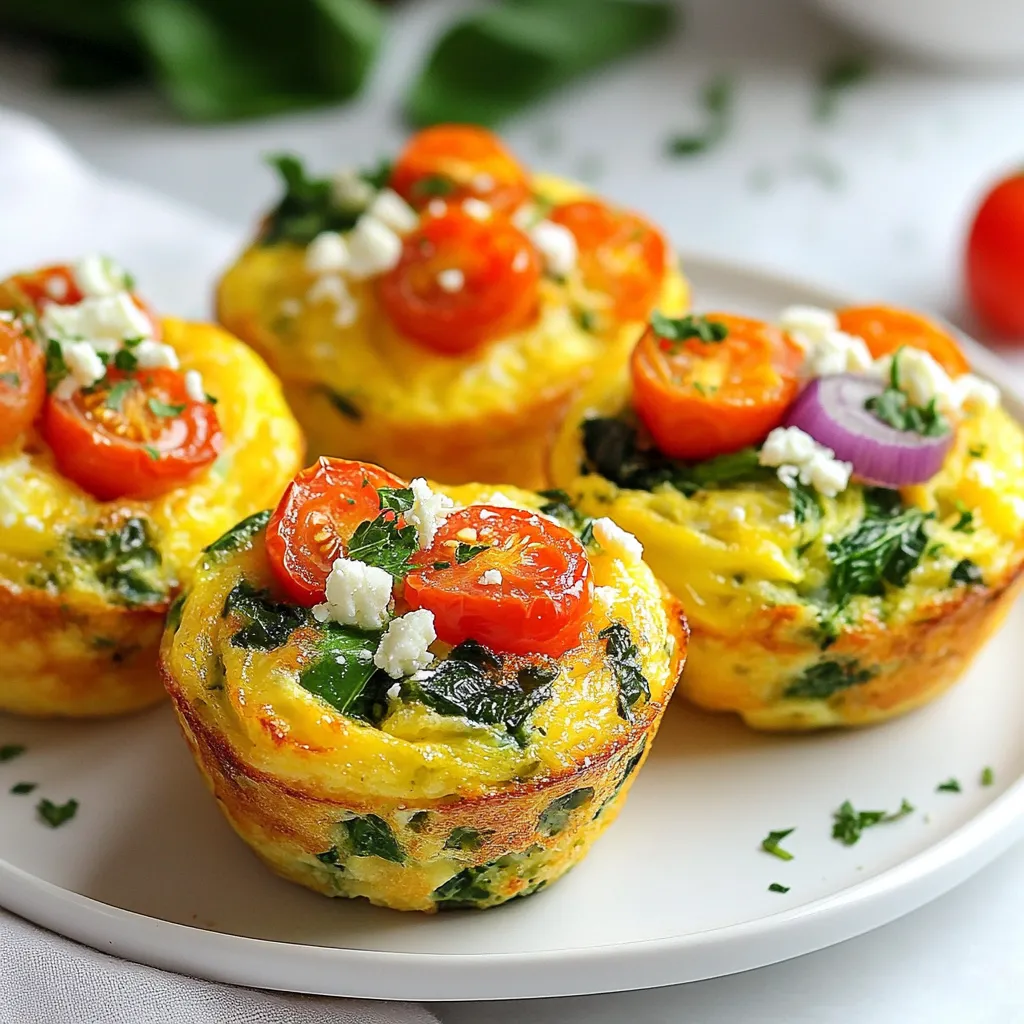 To make tasty veggie loaded egg muffins, gather these key ingredients: - 6 large eggs - 1/2 cup milk (dairy or non-dairy) - 1 cup spinach, chopped - 1/2 cup bell peppers, diced (mix of colors for vibrancy) - 1/4 cup red onion, finely chopped - 1/2 cup cherry tomatoes, halved - 1/3 cup feta cheese, crumbled - 1 teaspoon garlic powder - 1 teaspoon dried oregano - Salt and pepper to taste - Olive oil or cooking spray for greasing the muffin tin These ingredients blend well to create a fluffy and flavorful muffin. They keep the muffins moist and tasty. Each ingredient plays a role in flavor and texture. You can add extra ingredients to enhance the taste. Consider these options: - Cooked bacon or sausage for a meaty touch - Zucchini or mushrooms for added veggies - Jalapeños for a spicy kick - Different cheeses like cheddar or mozzarella Feel free to mix and match! These add-ins let you customize your muffins based on your taste. Each serving provides a healthy boost. Here is the approximate nutritional breakdown: - Calories: 100 - Protein: 7g - Total Fat: 6g - Carbohydrates: 4g - Fiber: 1g - Sugars: 1g These muffins are both filling and nutritious. They give you energy without too many calories. Enjoy them as a quick breakfast or snack! {{ingredient_image_1}} First, set your oven to 375°F (190°C). This temperature helps the muffins rise and cook well. Next, grab a muffin tin and grease each cup with olive oil or cooking spray. This step keeps the muffins from sticking. In a large bowl, crack open the 6 large eggs. Whisk them together until they look uniform. Then, add 1/2 cup of milk. Whisk again until the mixture is smooth. Now, it's time to add the fun stuff! Stir in 1 cup of chopped spinach, 1/2 cup of diced bell peppers, and 1/4 cup of finely chopped red onion. Toss in 1/2 cup of halved cherry tomatoes and 1/3 cup of crumbled feta cheese. Finally, sprinkle in 1 teaspoon of garlic powder, 1 teaspoon of dried oregano, and some salt and pepper to taste. Mix everything well, ensuring all the veggies and cheese are evenly spread out. Pour the egg mixture into the prepared muffin cups. Fill each one about 3/4 full; this gives the muffins room to puff up. Place the muffin tin in the oven and bake for 18 to 20 minutes. You know they are done when they are puffed and a toothpick inserted in the center comes out clean. After baking, let the muffins cool for a few minutes. Use a knife to gently run around the edges to help remove them from the tin. Enjoy them warm, or let them cool completely and store them in an airtight container in the fridge for up to 5 days. To whisk eggs well, use a medium bowl. Crack the eggs in it. Use a fork or whisk to beat them. Mix until the yolks and whites blend together. Add the milk and combine until smooth. This step adds fluffiness to your muffins. Bake the muffins for 18-20 minutes at 375°F (190°C). Check for doneness by inserting a toothpick. If it comes out clean, they are ready. The tops should look puffed and slightly golden. Avoid overbaking, as they can dry out quickly. For a lovely presentation, arrange the muffins on a colorful platter. Add fresh herbs like parsley or basil for a pop of color. You can also serve them with salsa or hot sauce on the side. This adds flavor and excitement to each bite. Pro Tips Vegetable Variations: Feel free to mix and match your favorite vegetables. Zucchini, mushrooms, or kale can add different flavors and textures. Cheese Choices: Experiment with different cheeses such as cheddar, mozzarella, or goat cheese for a unique taste. Meal Prep Friendly: These egg muffins can be made ahead of time and stored in the fridge, making them a great option for busy mornings. Serving Suggestions: Try serving your egg muffins with a side of avocado or a light salad for a complete meal. {{image_2}} You can mix and match veggies for your muffins. Try zucchini, carrots, or mushrooms. Broccoli and kale also work great. Use your favorites for a tasty twist. Just chop them small so they cook well. To make these muffins dairy-free, swap milk with almond or oat milk. You can skip feta cheese or use a vegan cheese. Silken tofu can replace eggs for a vegan version. Blend it until smooth, and you'll have a great base for your muffins. Adding spices can change the whole flavor! Try chili powder for heat or smoked paprika for depth. Fresh herbs like basil or cilantro can brighten the taste. Just one teaspoon of your favorite spice can give these muffins a fun kick. After you enjoy your veggie loaded egg muffins, let them cool. Place the muffins in an airtight container. Store them in the fridge for up to five days. This keeps them fresh and tasty. If you want to save muffins for later, freezing is a great option. First, make sure they are fully cooled. Wrap each muffin in plastic wrap. Then, place them in a freezer-safe bag or container. Label the bag with the date. You can freeze them for up to three months. When you are ready to eat the muffins, reheating is easy. You can use the microwave, oven, or toaster oven. For the microwave, heat one muffin for about 30 seconds. If using the oven, preheat it to 350°F (175°C) and bake for about 10 minutes. This method helps keep the muffins soft and fluffy. Enjoy your tasty treat! Yes, you can make these muffins in advance. They store well in the fridge for up to five days. Just let them cool completely before placing them in an airtight container. You can also freeze them for longer storage. Just wrap each muffin in plastic wrap and place them in a freezer bag. They keep well for about three months. When you’re ready to eat, thaw them in the fridge overnight and reheat in the oven or microwave. You can mix many tasty vegetables into these muffins. Spinach is a great base. Bell peppers add color and crunch. You can also try diced zucchini, mushrooms, or broccoli. Onions add a nice flavor kick. For a bit of heat, consider adding jalapeños. Feel free to get creative with your chosen veggies. The option