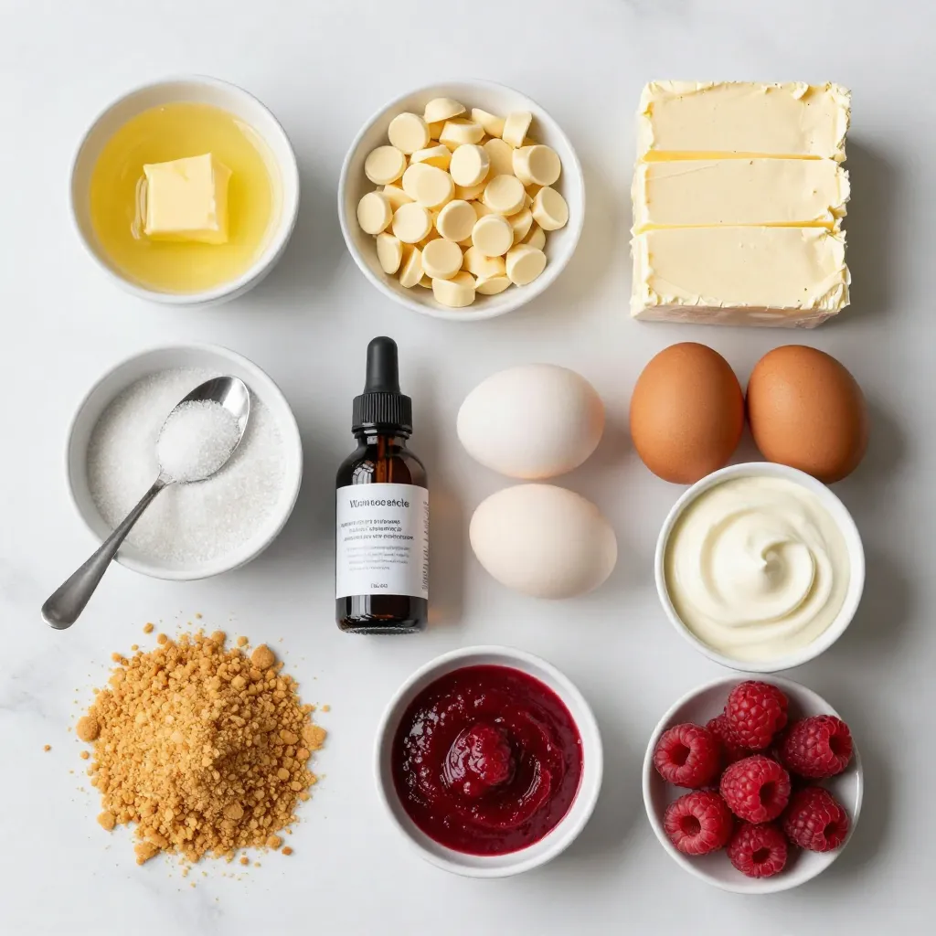 Each ingredient plays an important role in making the cheesecake creamy and flavorful. The graham cracker crumbs form the base, while the white chocolate adds a sweet, rich taste. The cream cheese gives the cheesecake its signature smooth texture. Fresh raspberries bring a burst of fruity flavor and a lovely color.